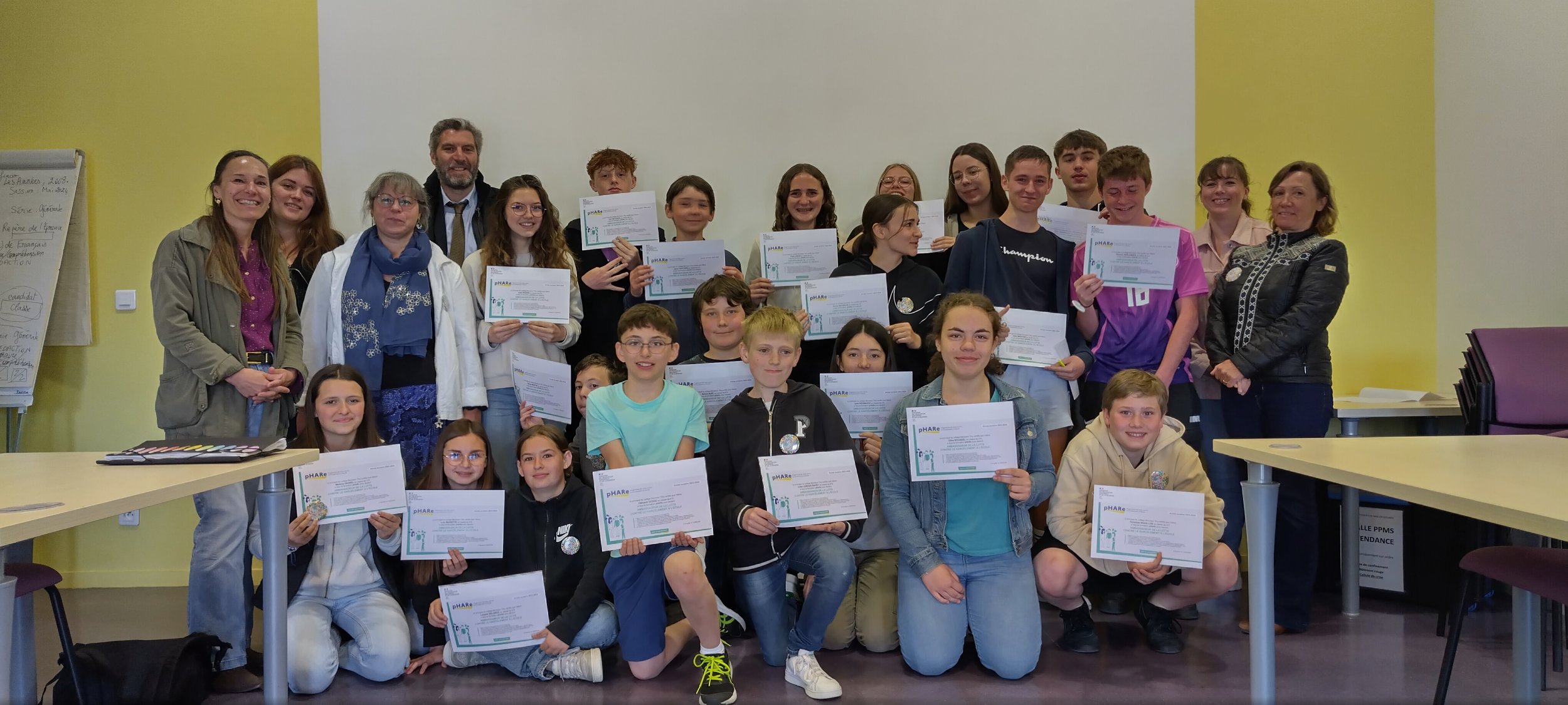Ce lundi 10 juin 2024, les élèves ambassadeurs de la lutte contre le harcèlement du programme pHARe ont reçu un diplôme pour valoriser leur engagement ainsi qu’un badge à l’effigie du logo qu’ils ont eux -même créé afin d’être plus facilement identifié par tous.